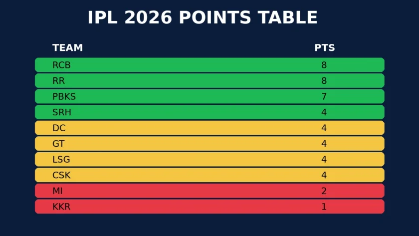 With this victory, Royal Challengers Bengaluru moved to the top of the IPL 2026 points table. Their strong net run rate and consistent performances helped them reach the top spot.