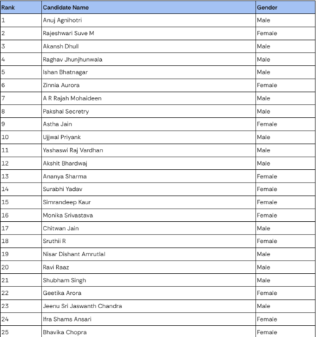 Several other women candidates also secured positions among the top 25. These include Zinnia Aurora (AIR 6), Astha Jain (AIR 9), Ananya Sharma (AIR 13), Surabhi Yadav (AIR 14), Simrandeep Kaur (AIR 15), Monika Srivastava (AIR 16), Sruthii R (AIR 18), Geetika Arora (AIR 22), Ifra Shams Ansari (AIR 24), and Bhavika Chopra (AIR 25).